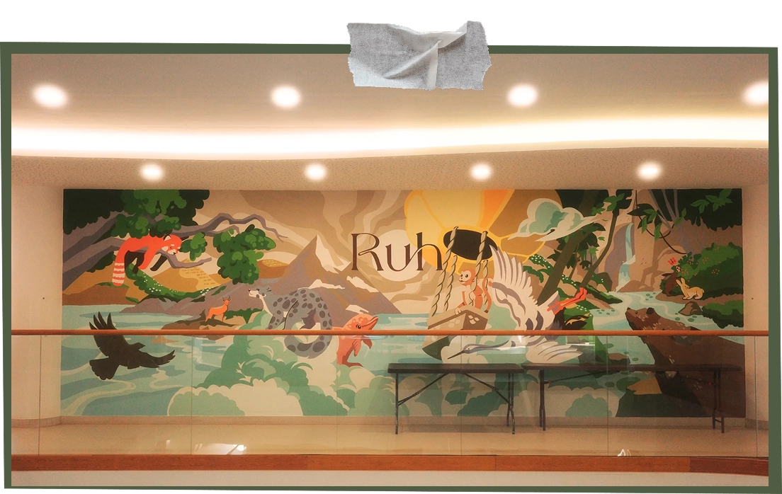 Learner Profile Mural, prominently painted on the wall, celebrates the values and attributes we nurture in our children, serving as a daily reminder of the qualities that guide our educational philosophy. In this mural, the artist imagines the IB Learner Profile as a living ecosystem. Each attribute is embodied by a creature of the natural world, Caring as a red panda, Risk-taker as an eagle, Thinker as an owl, and others that inhabit rivers, glaciers, deserts, and forests. Together, they form an interconnected landscape that reflects both the diversity of nature and the values that guide our learners. Just as every environment sustains life, every attribute sustains growth.